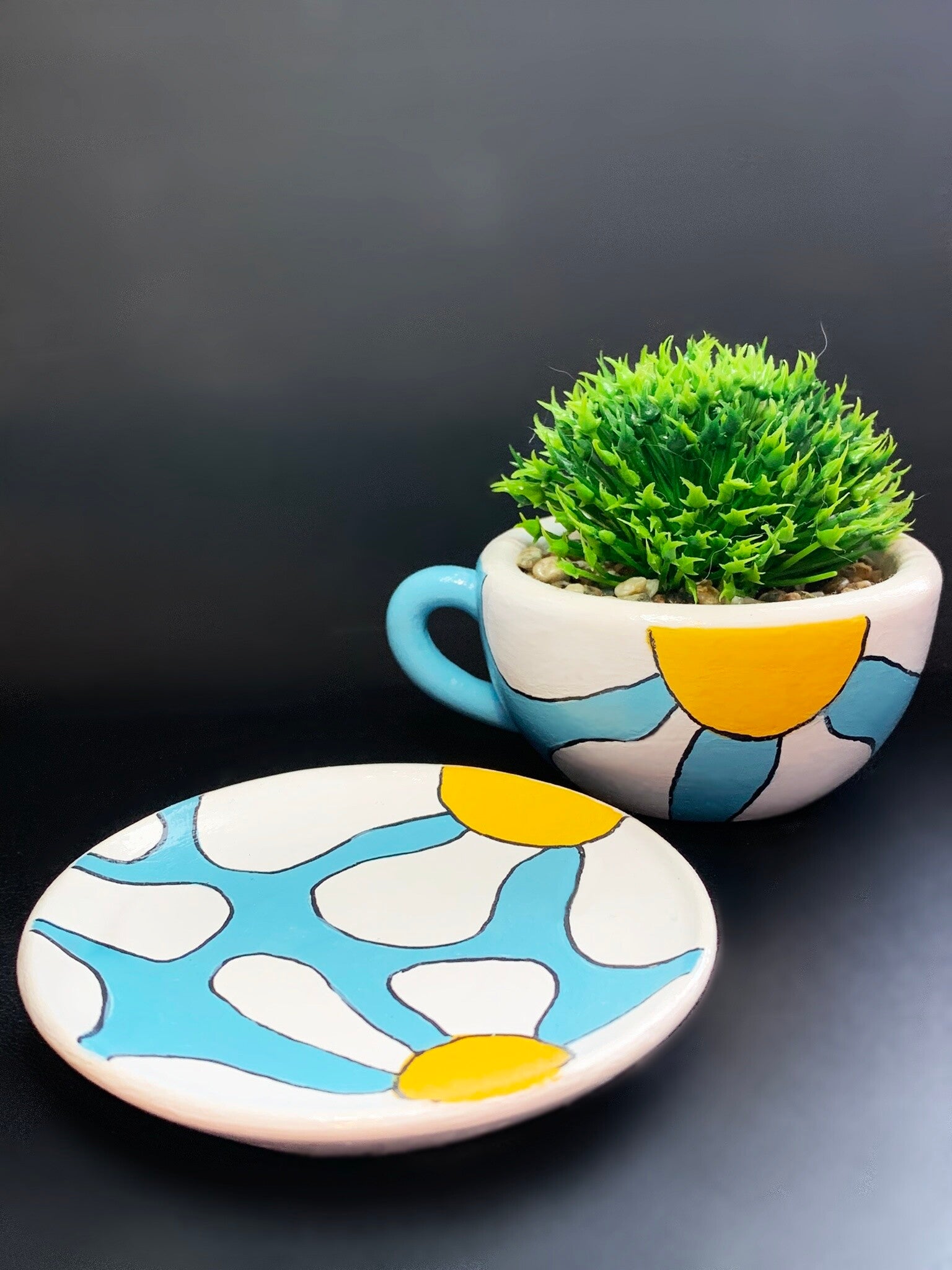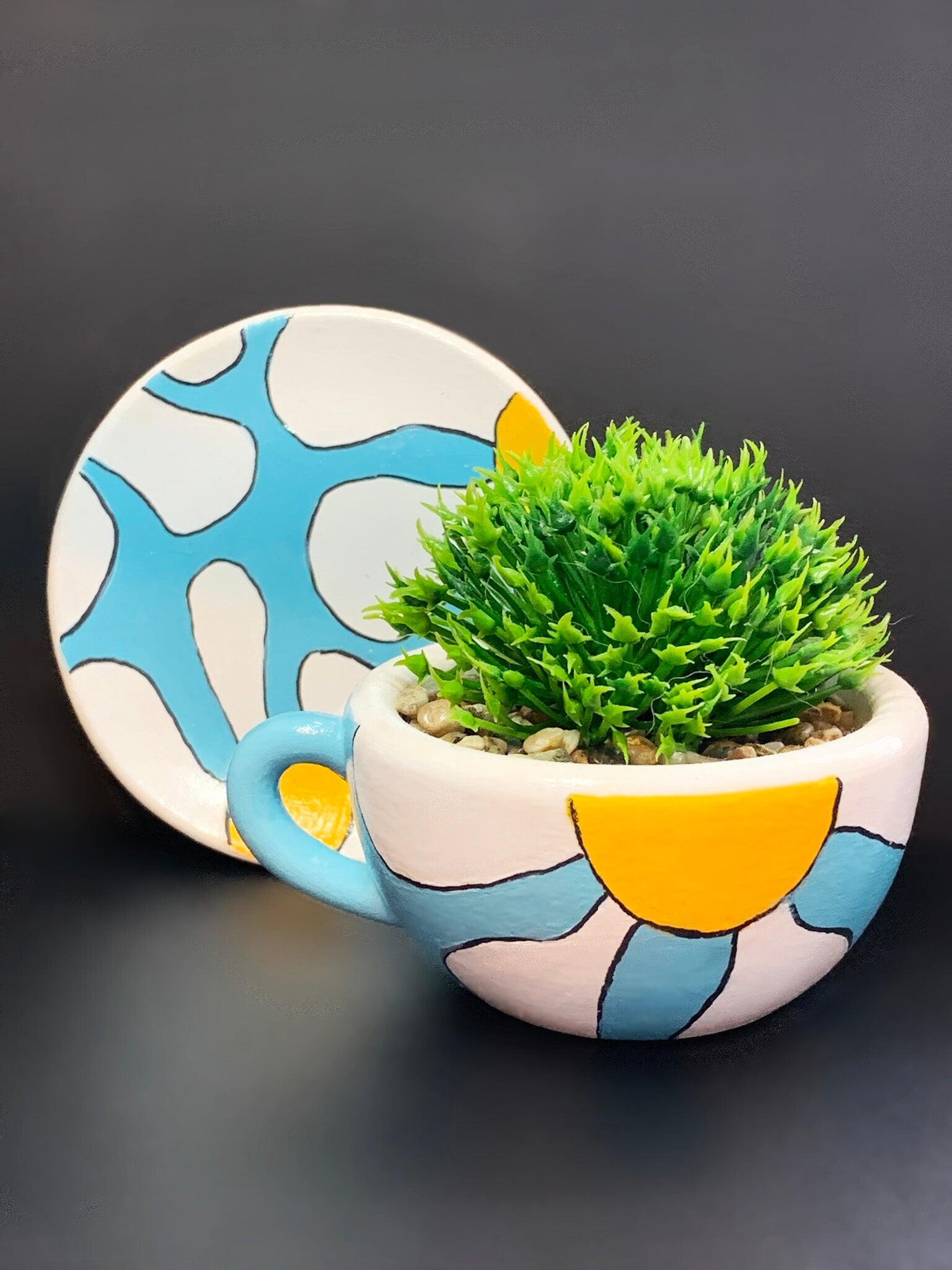 Add a charming, whimsical touch to your space with this beautifully hand-painted gypsum cup and saucer set, crowned with a vibrant succulent!