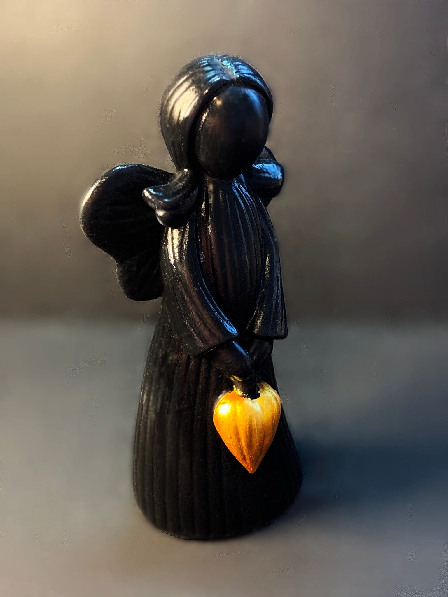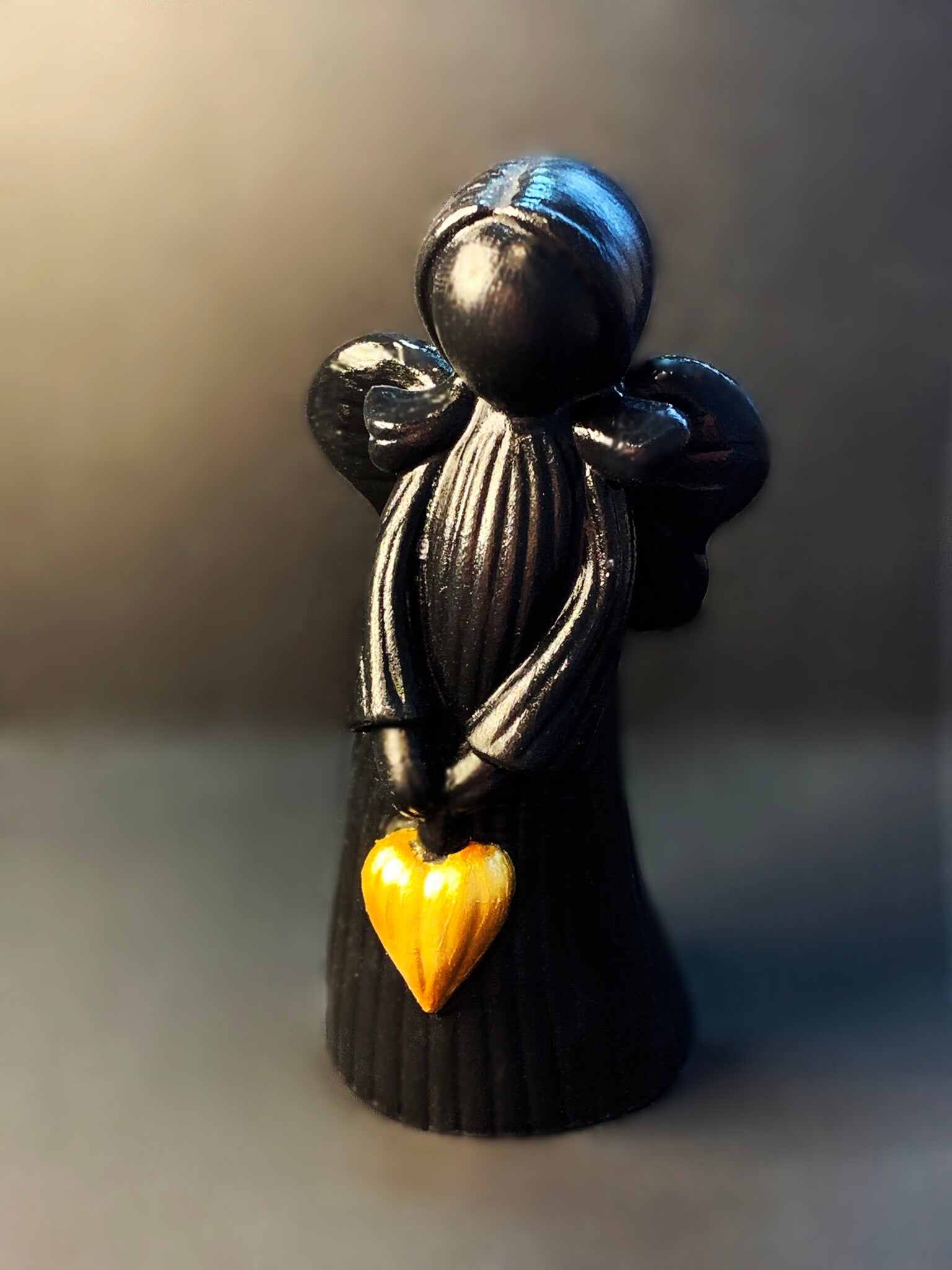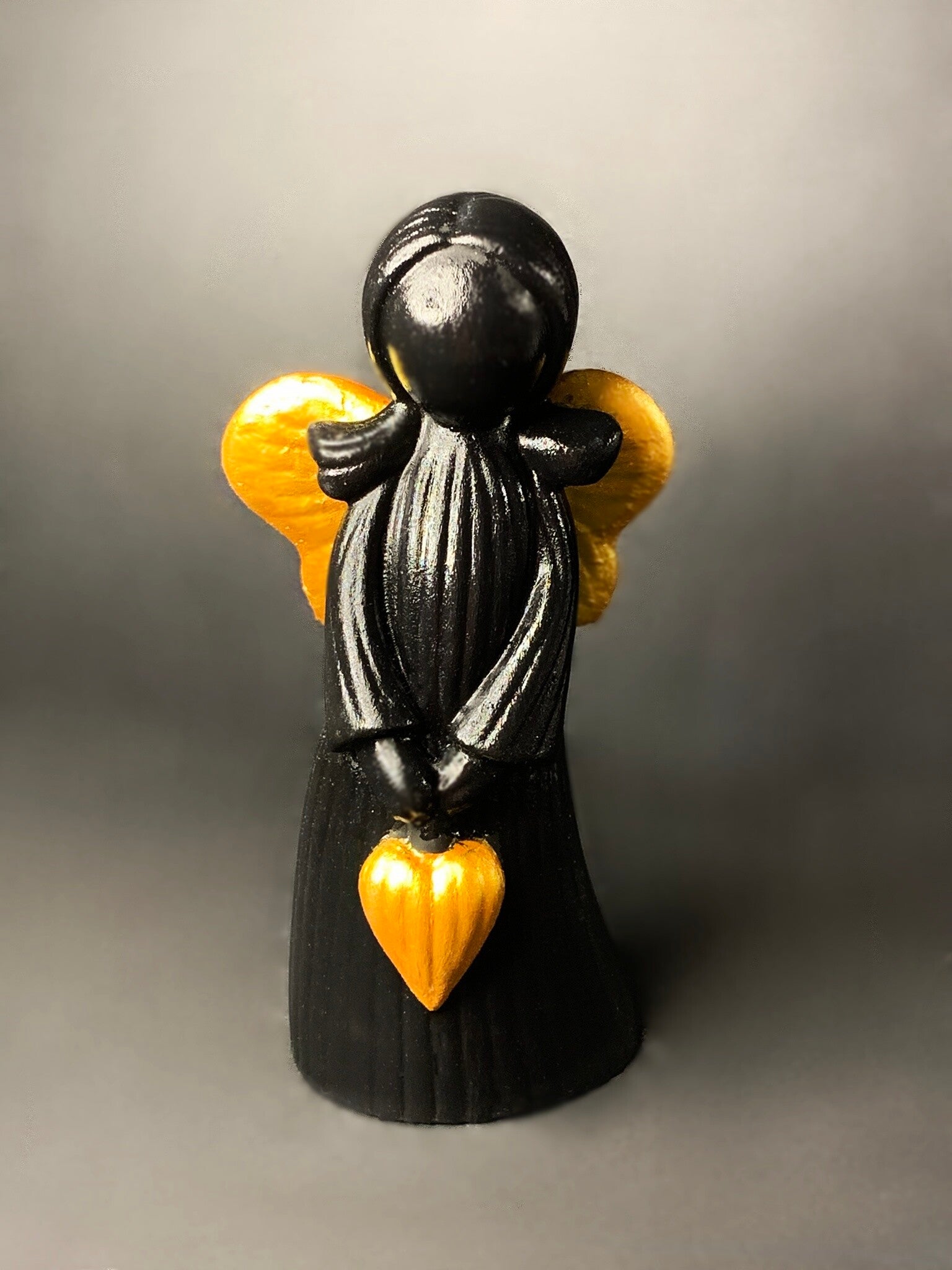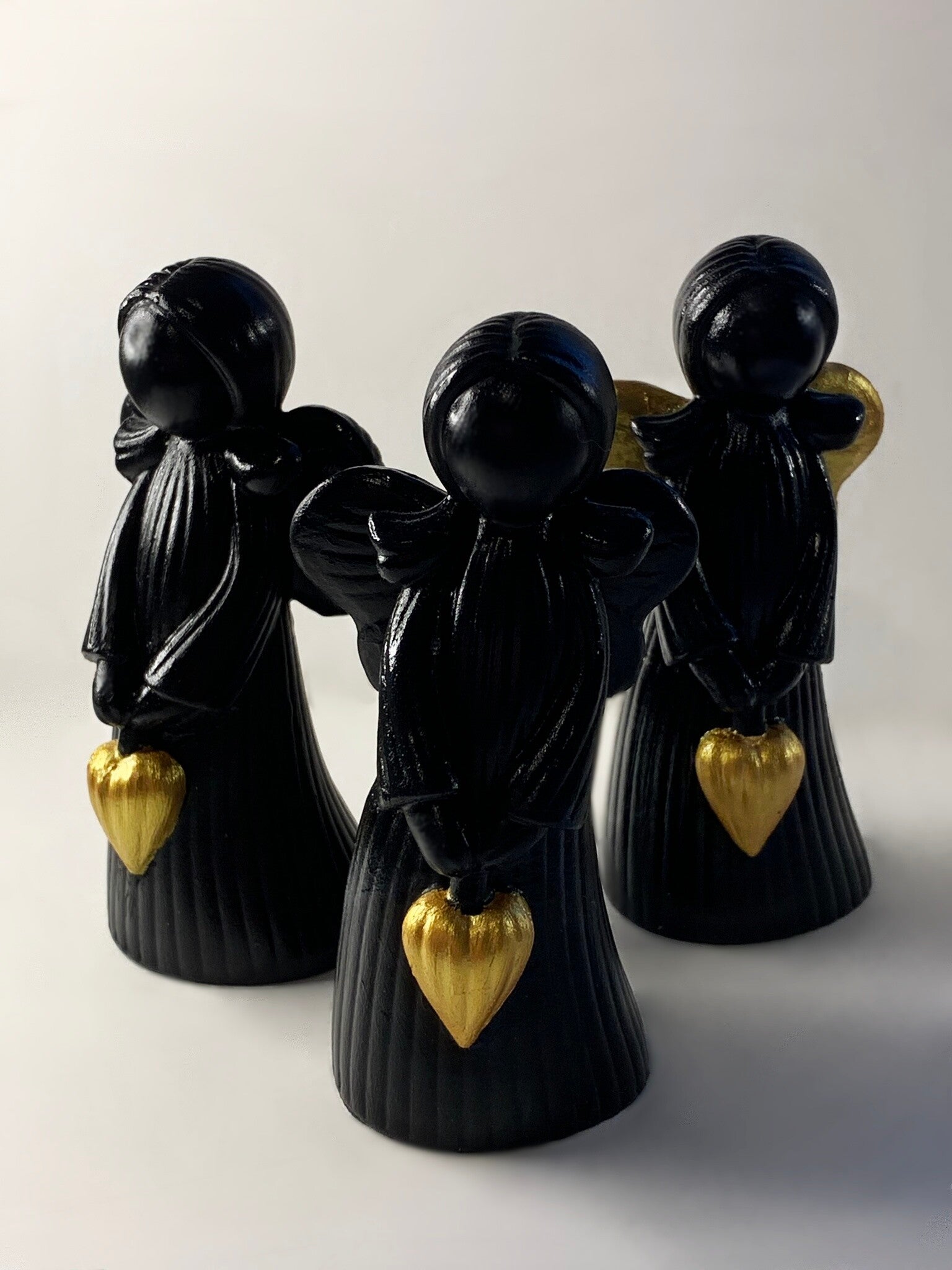 Each angel is lovingly handmade and carries a shimmering golden heart — a symbol of love and light. Available in black or white with optional golden wings, these elegant ornaments complement each other beautifully. Whether displayed together or gifted individually, they bring a touch of grace and warmth to your Christmas décor.