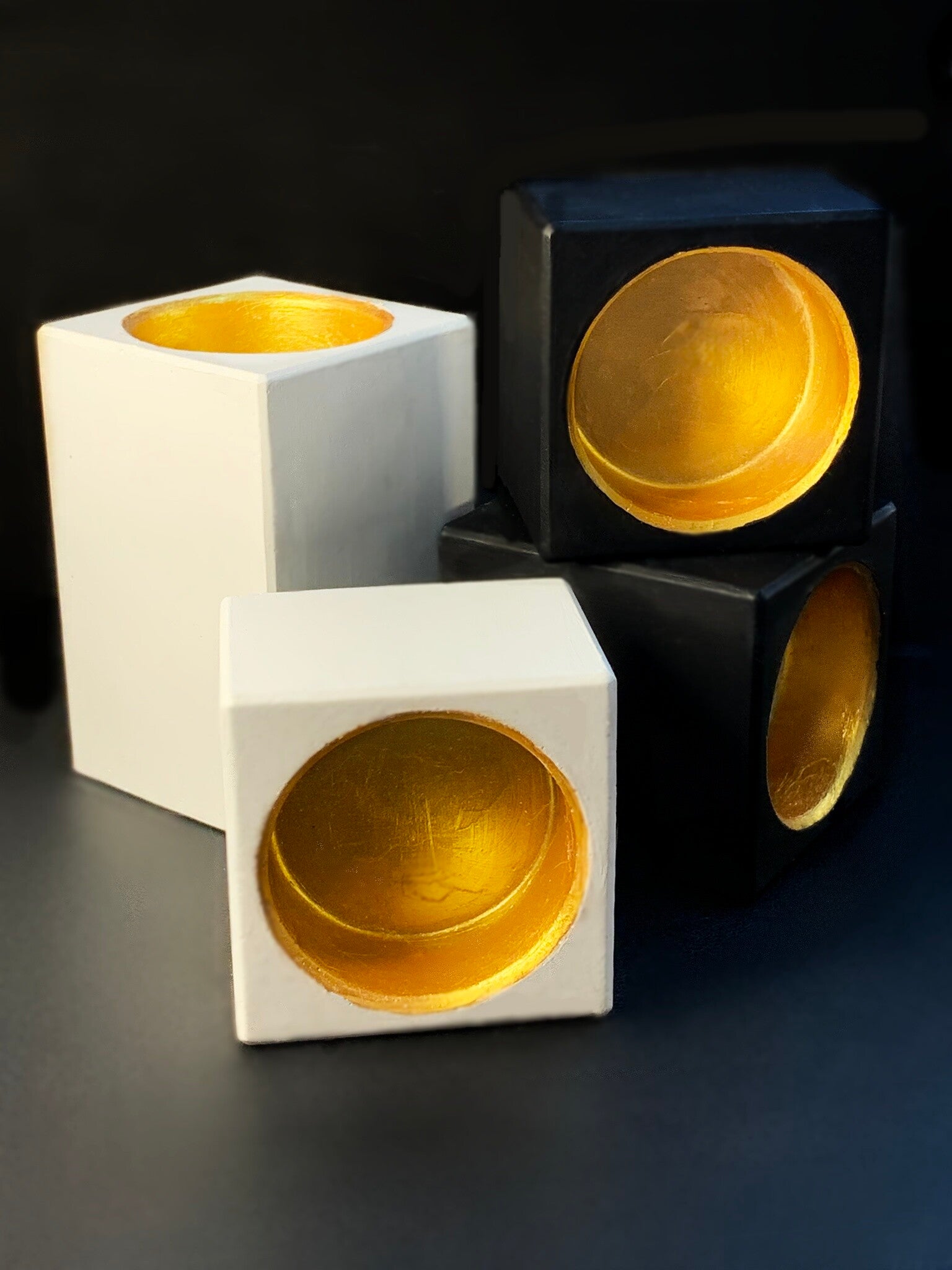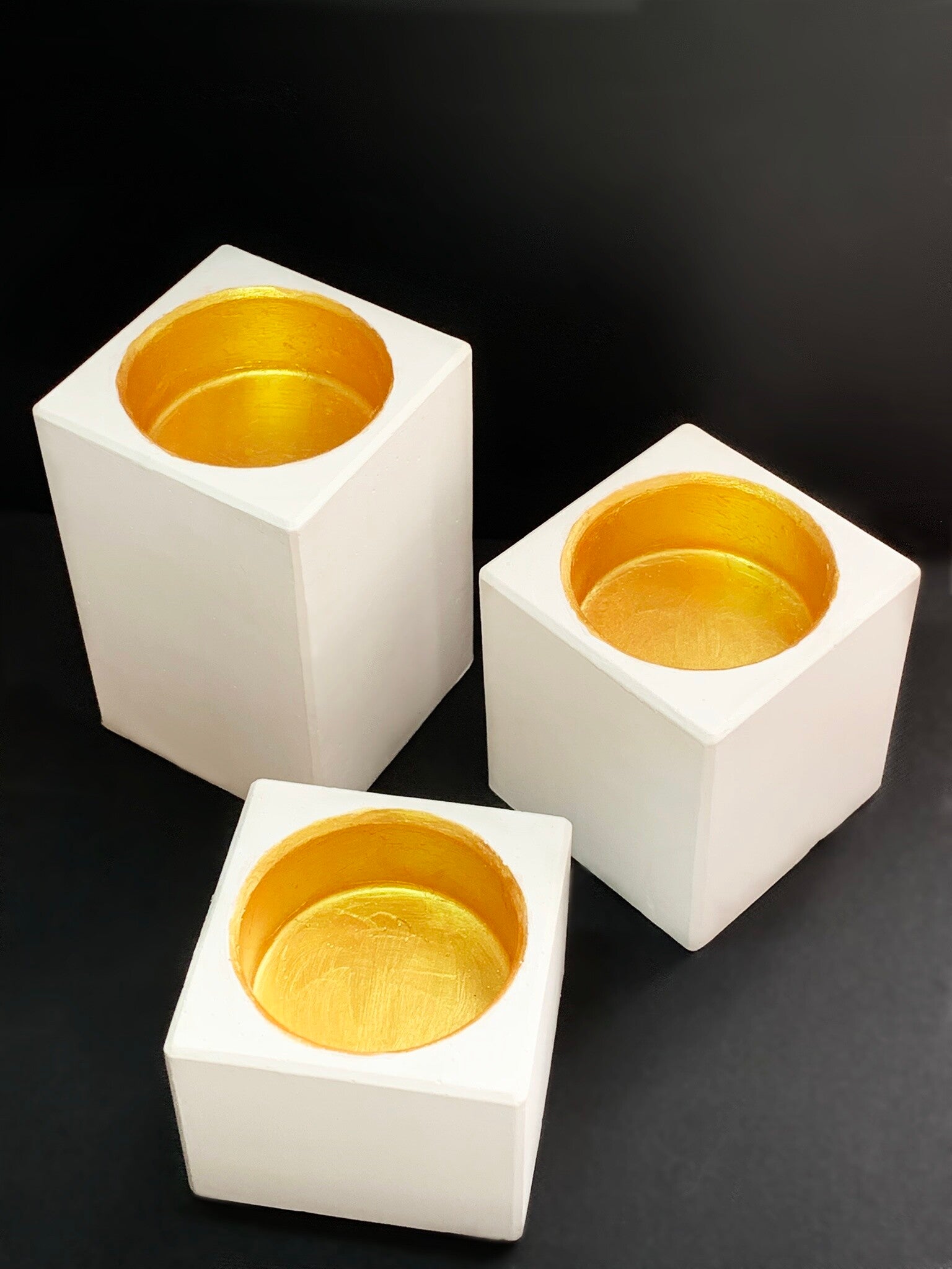 Elevate your space with this elegant trio of handcrafted gypsum tealight holders. Designed at staggered heights, they’re perfect for styling together on a console, coffee table, or shelf — or displayed individually as subtle statement pieces.