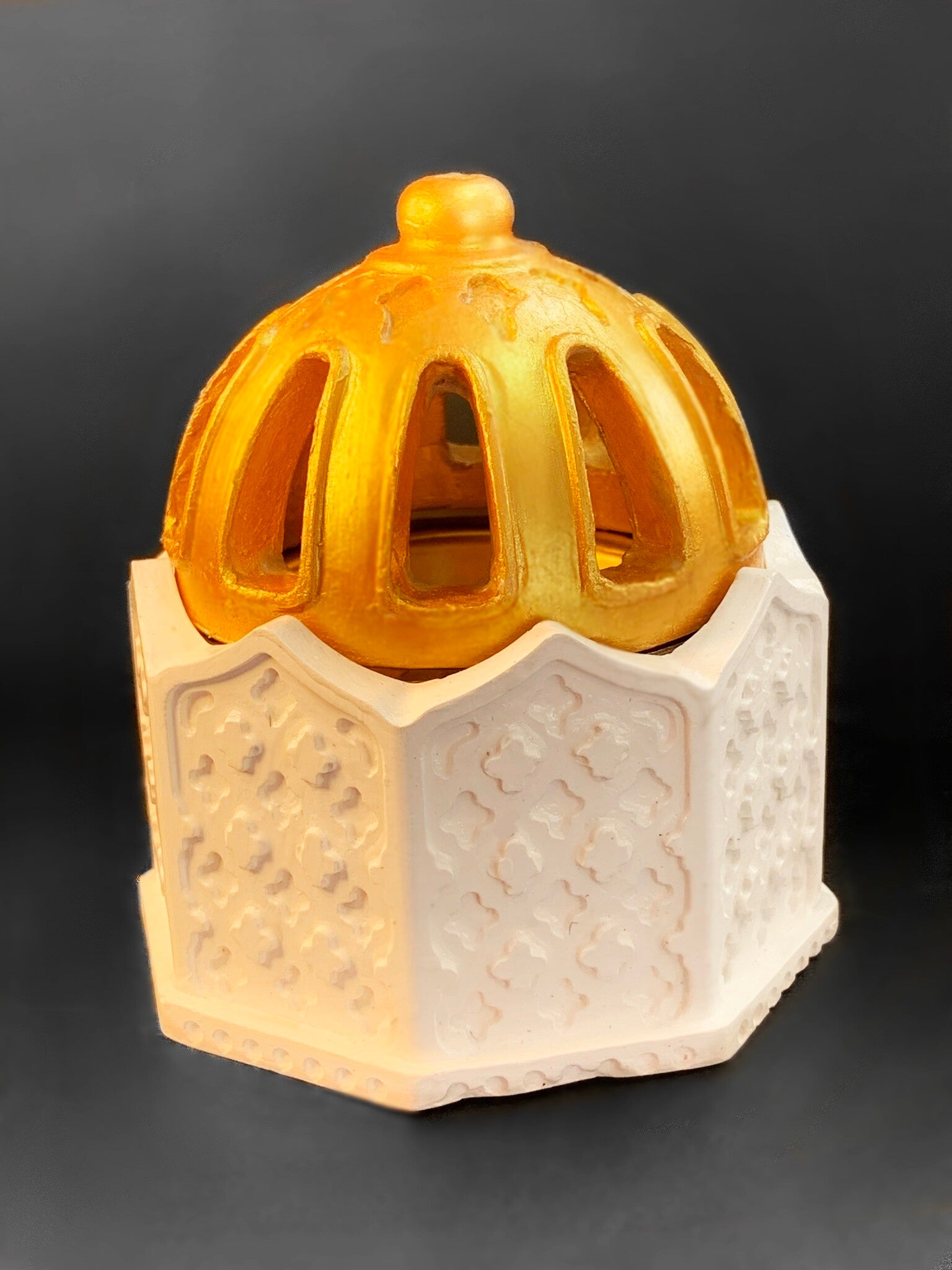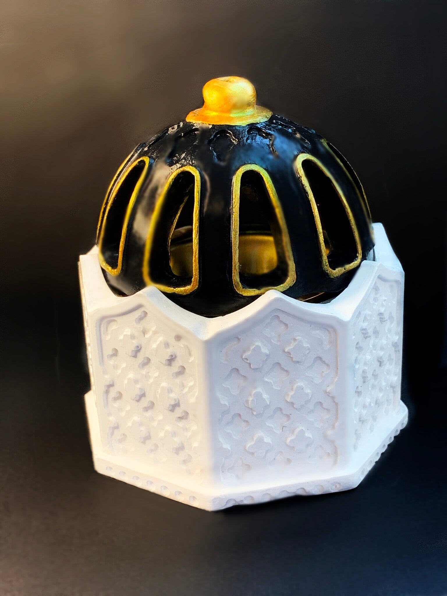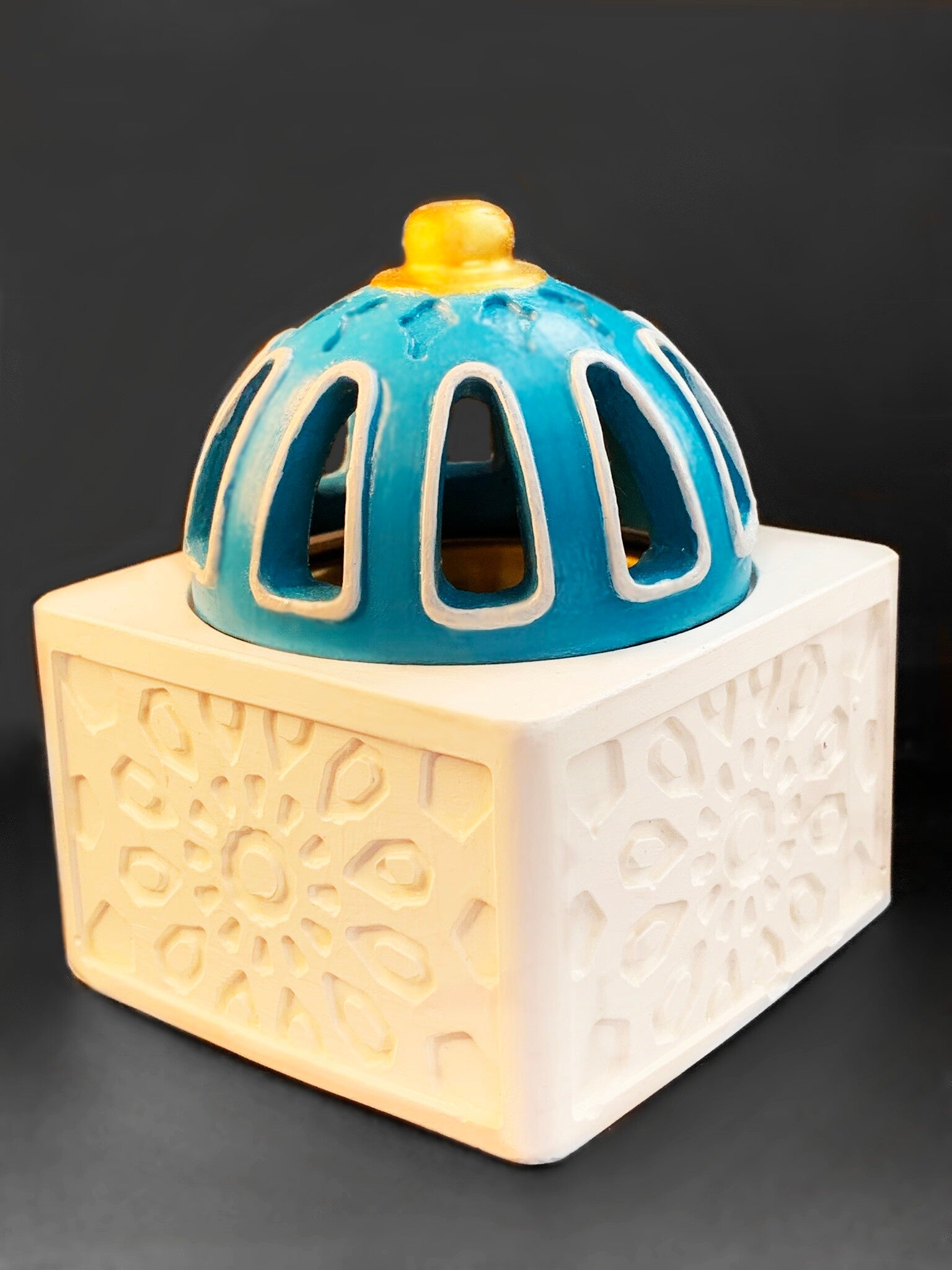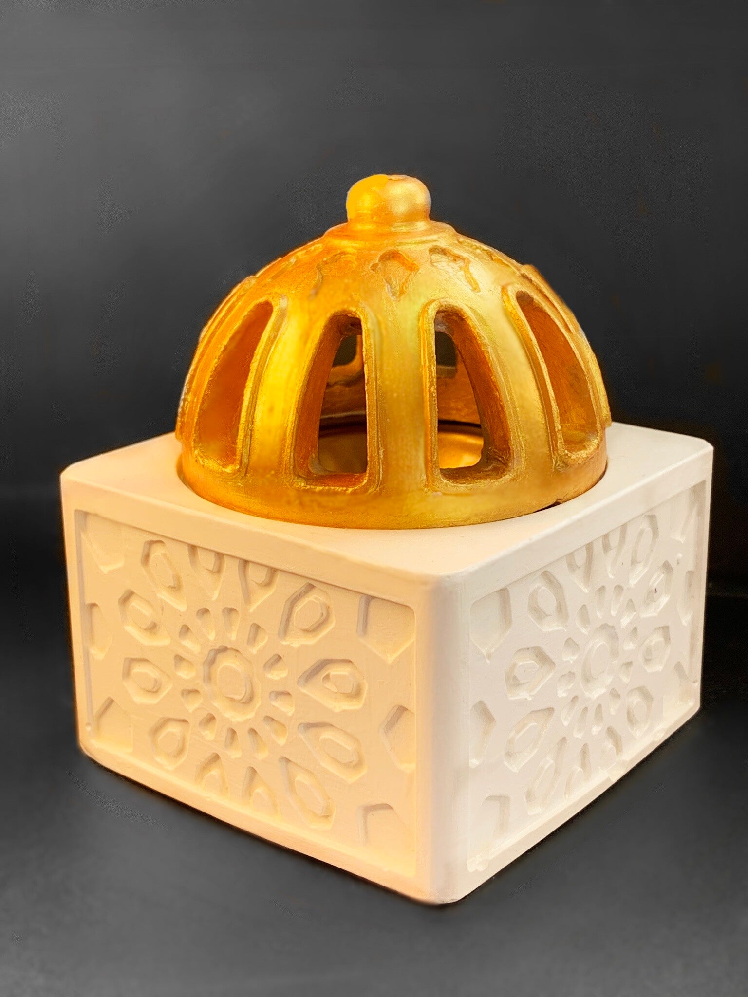 Crafted with precision and care, this mosque-shaped burner features a stunning architectural dome and base (available in various hand-painted finishes like gold, black, and serene pastels). It is ideal for moments of peaceful reflection, whether during prayer, the joyous spirit of Eid celebrations, or simply when you want to unwind and relax.