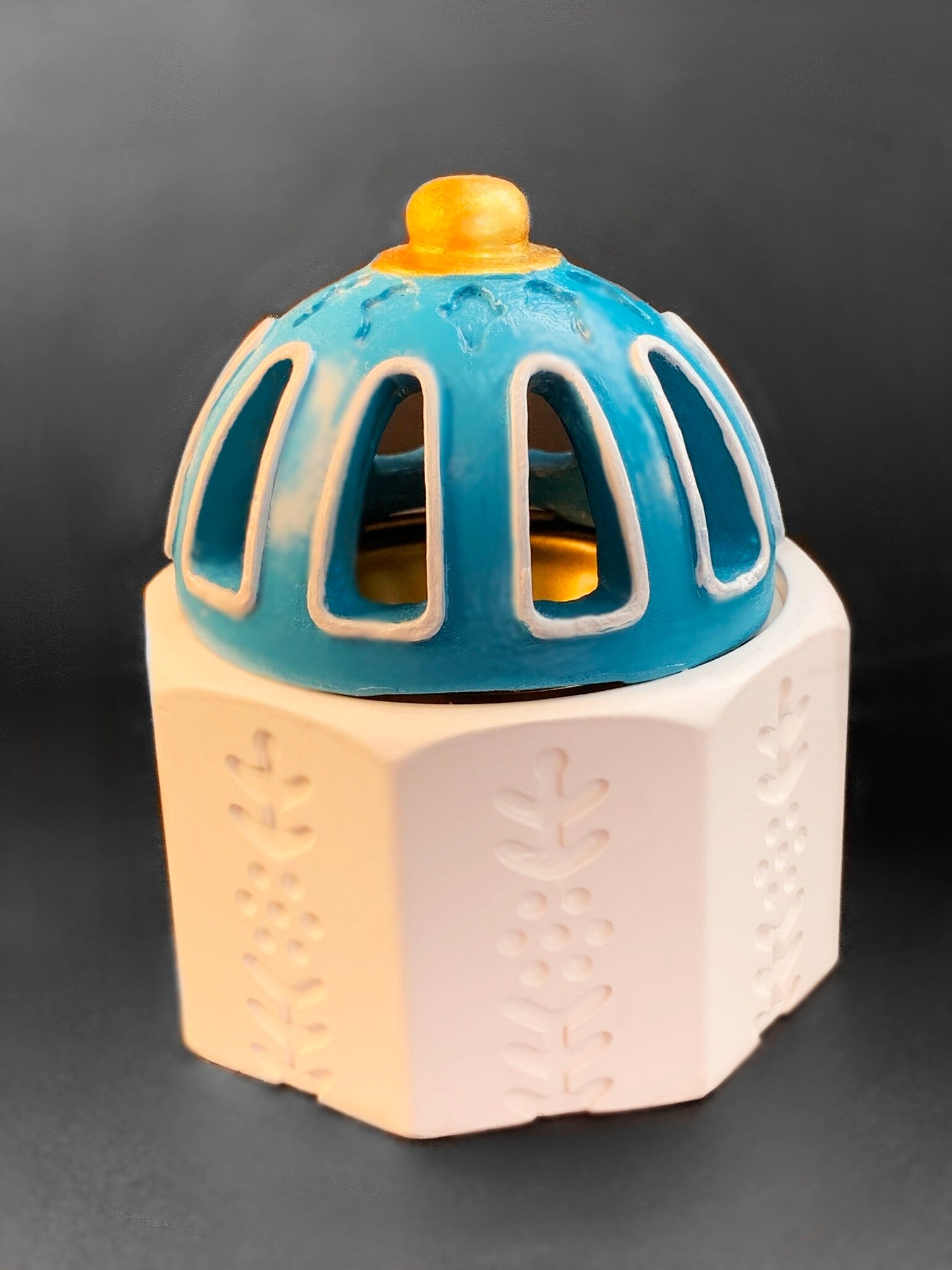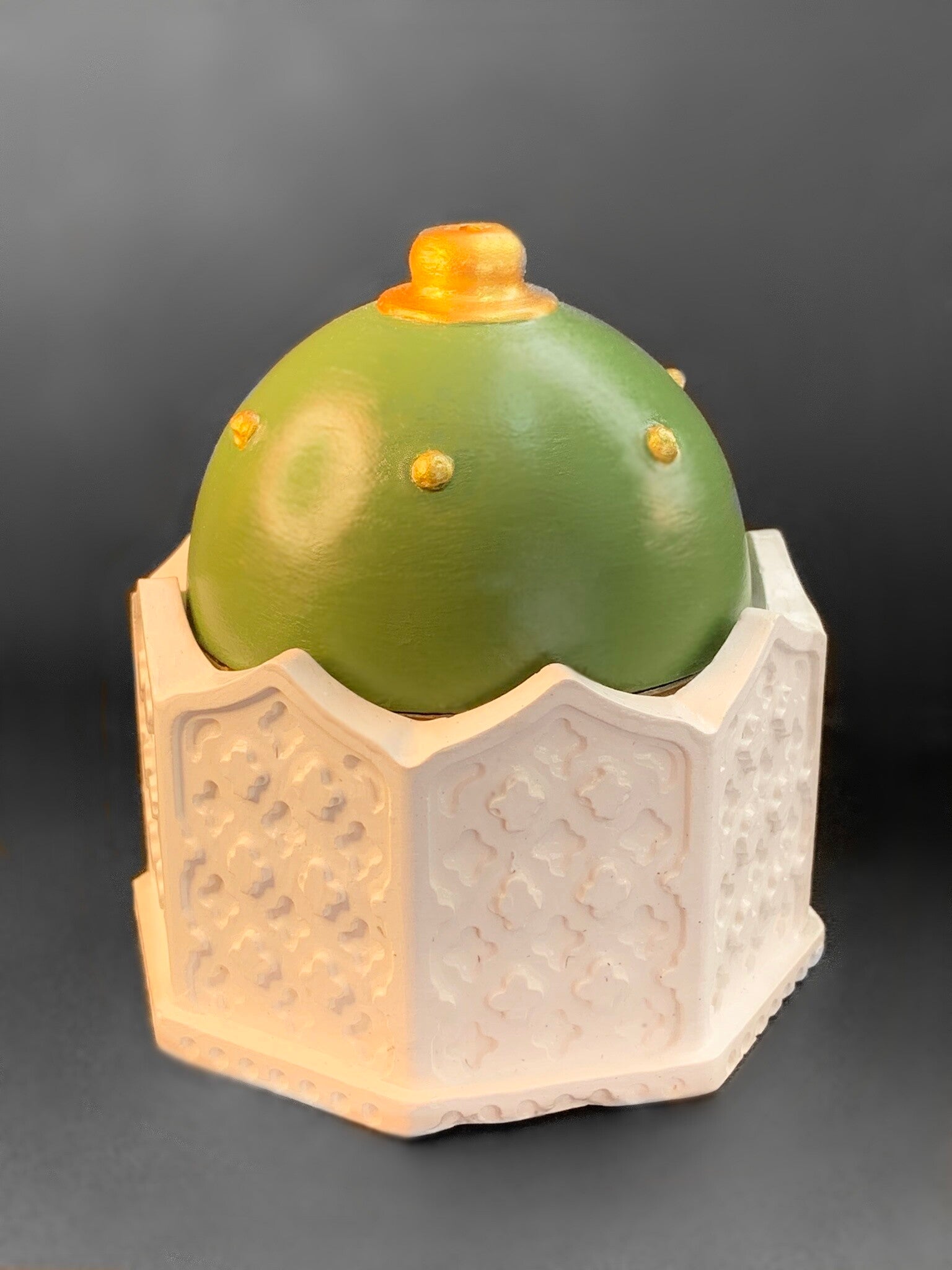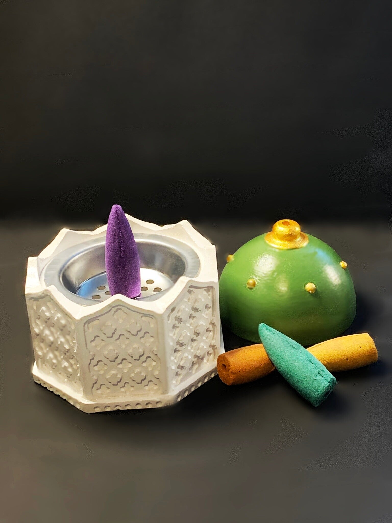 Crafted with precision and care, this mosque-shaped burner features a stunning architectural dome and base (available in various hand-painted finishes like gold, black, and serene pastels). It is ideal for moments of peaceful reflection, whether during prayer, the joyous spirit of Eid celebrations, or simply when you want to unwind and relax.