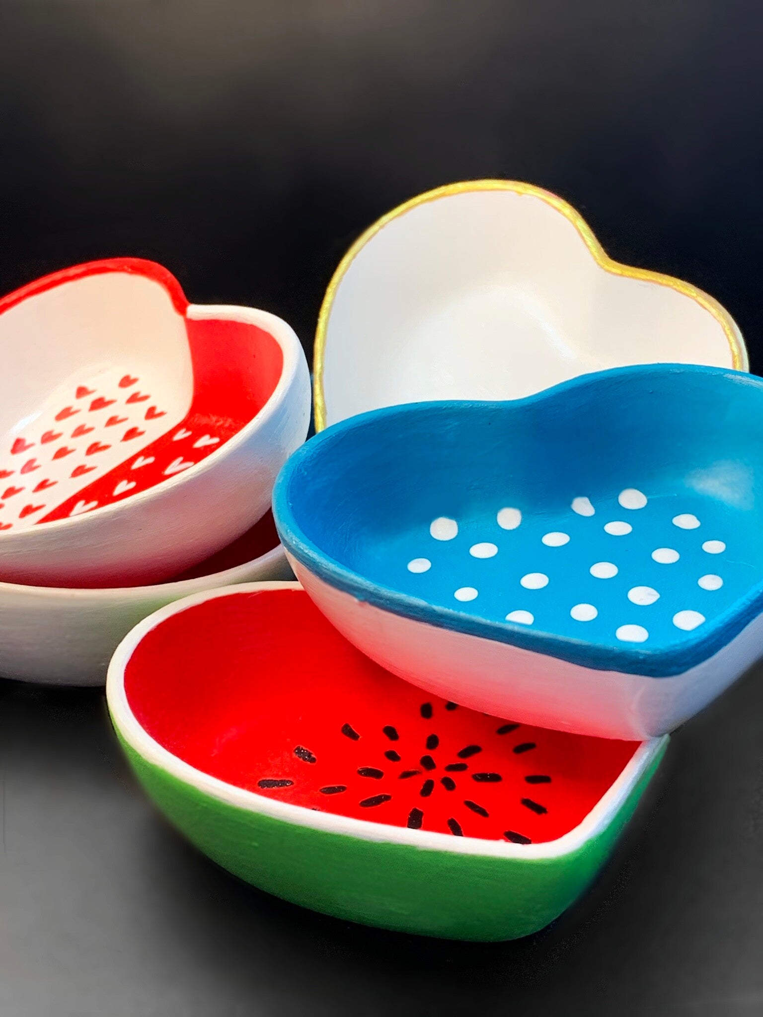 Each dish is thoughtfully shaped into a delicate heart and lovingly hand-painted with unique designs, ensuring every piece is one of a kind. Whether you prefer bold, vibrant colours (like the symbolic Watermelon design or classic Red and White hearts) or soft, minimalist tones, there’s a style to suit your personality, décor, and mood.