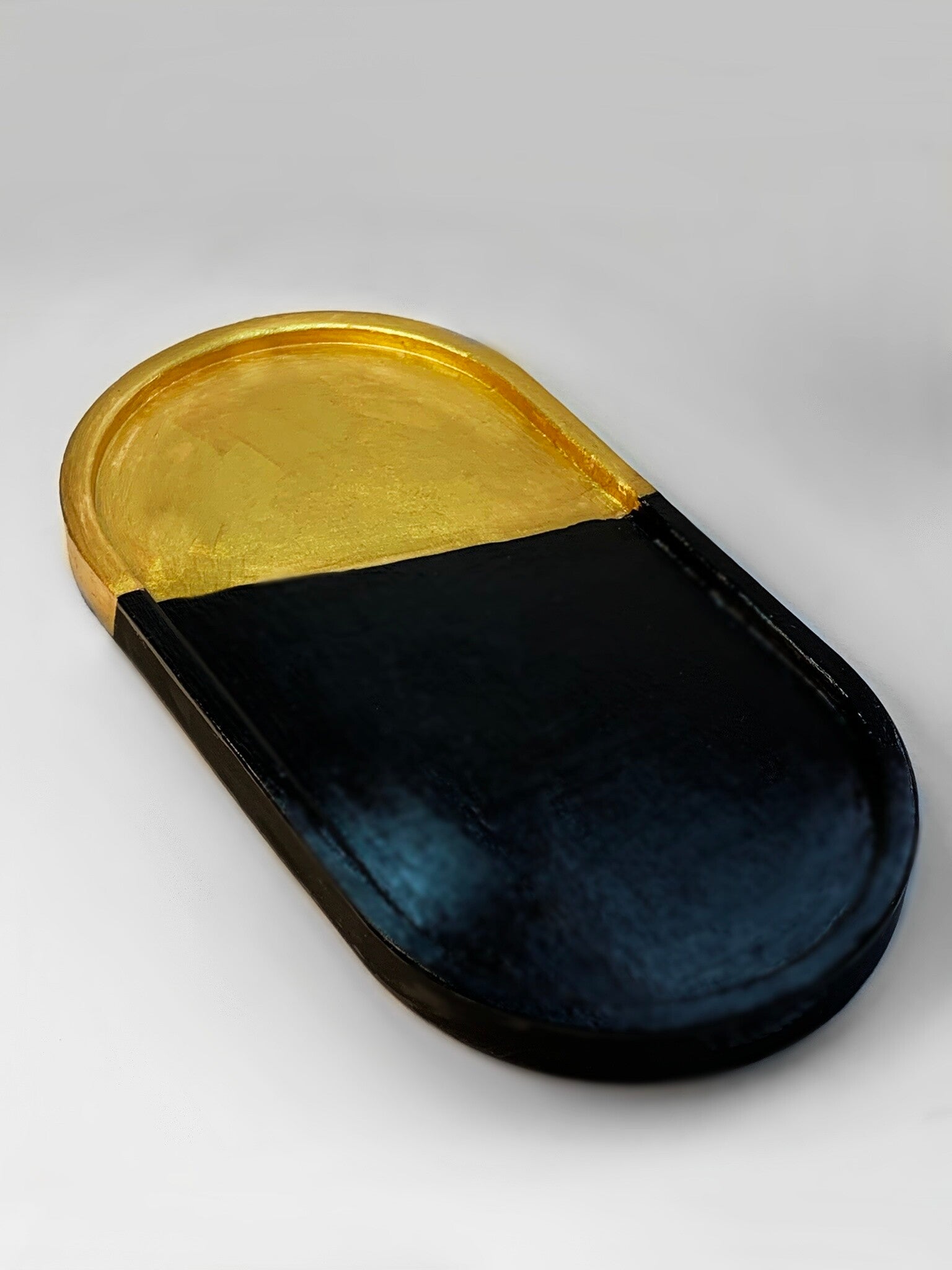 Made from eco-friendly gypsum and meticulously hand-painted for a unique, modern finish (featuring a striking gold leaf split design or a classic black and gold dip—specify finishes if possible), this tray is truly one-of-a-kind. Each piece is individually hand mixed and poured in small batches, so no two trays are ever the same.