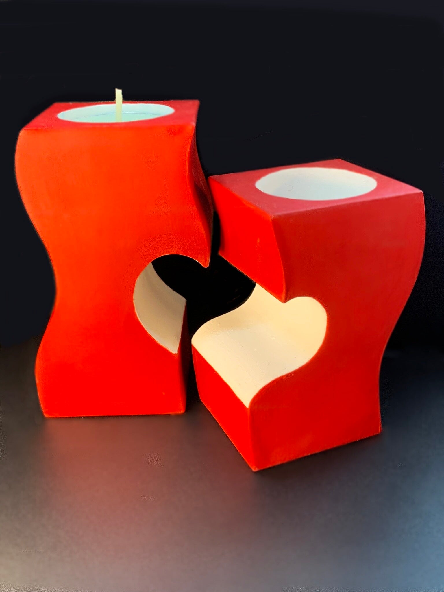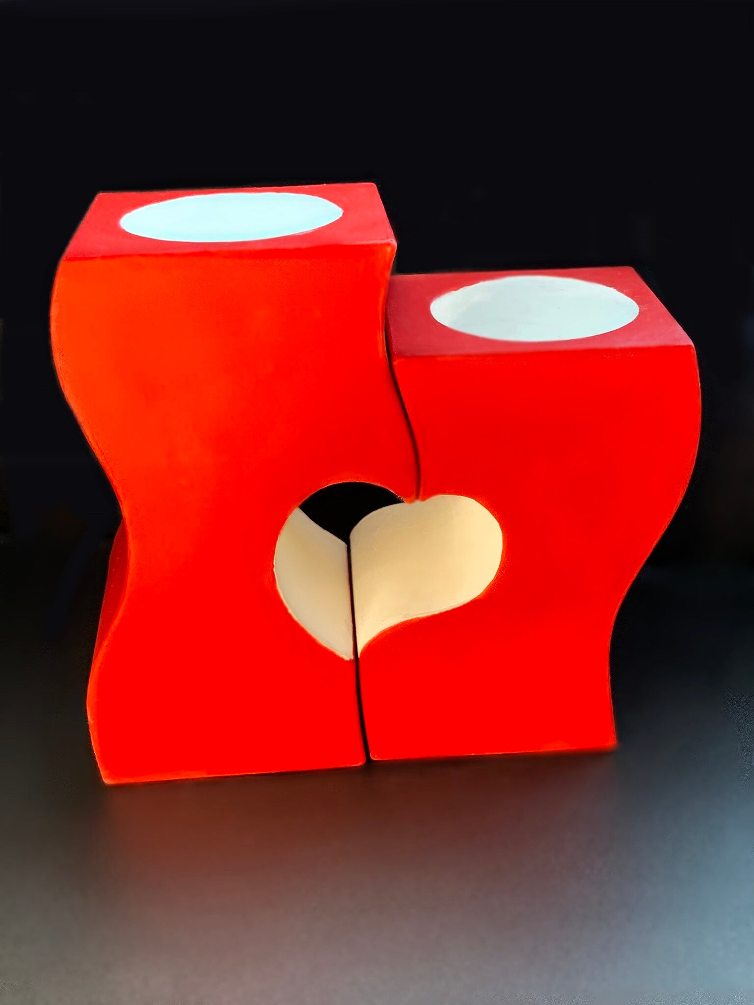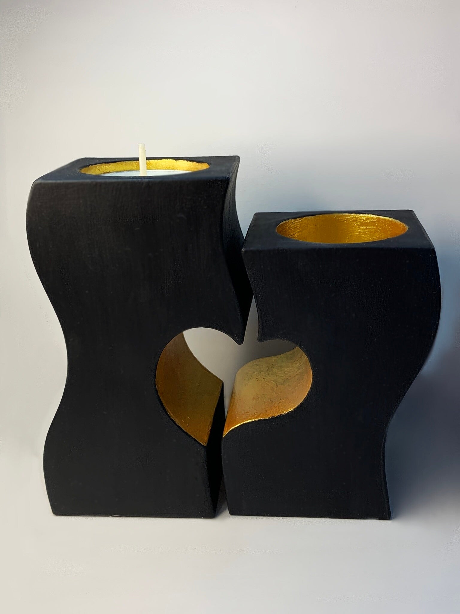 This unique set of two hand-crafted tea candle holders features an artistic, asymmetrical design that reveals a heart shape when the pieces are joined together. Each holder is made from high-quality gypsum and hand-painted in your choice of black and gold or red and white.