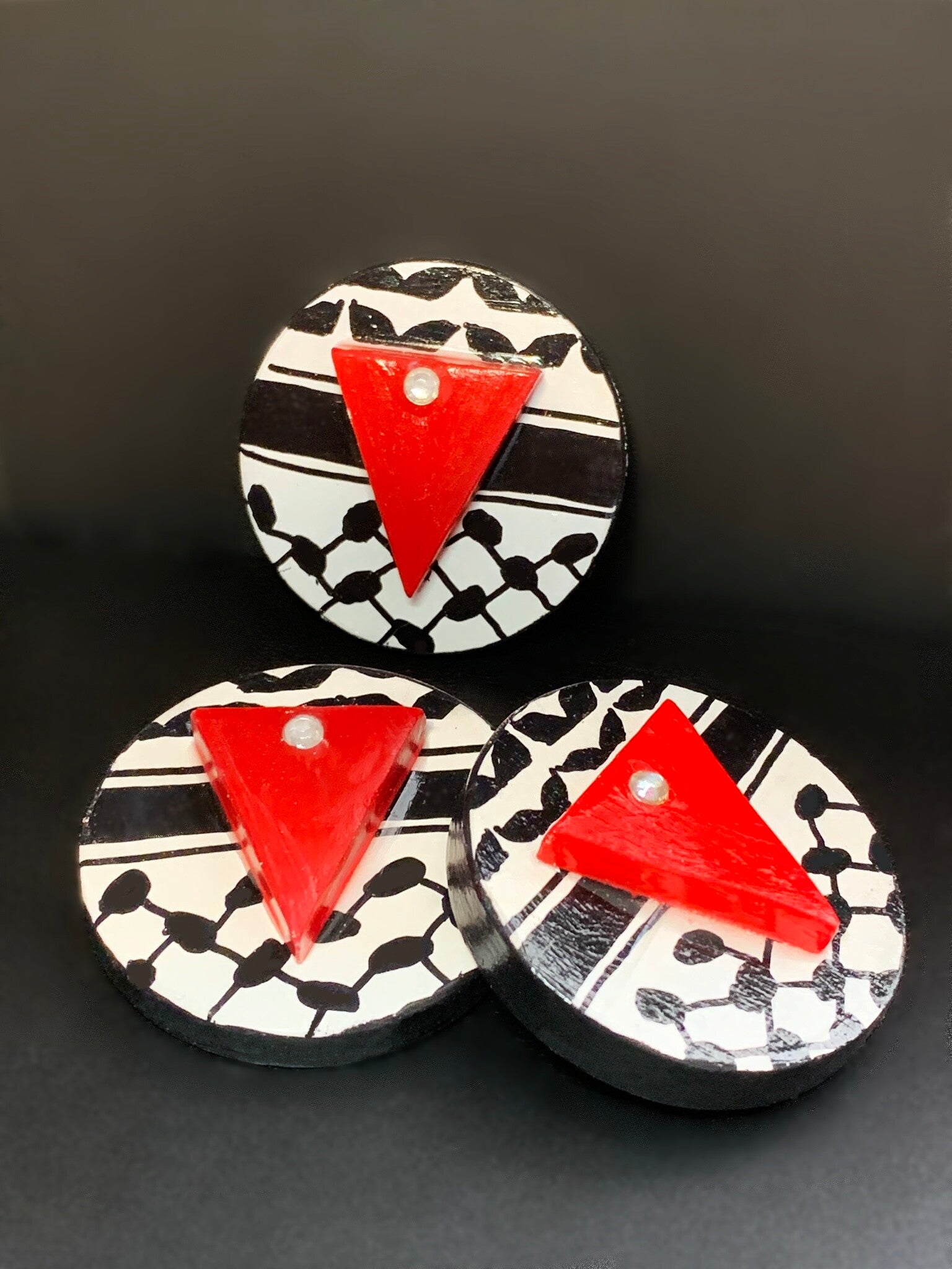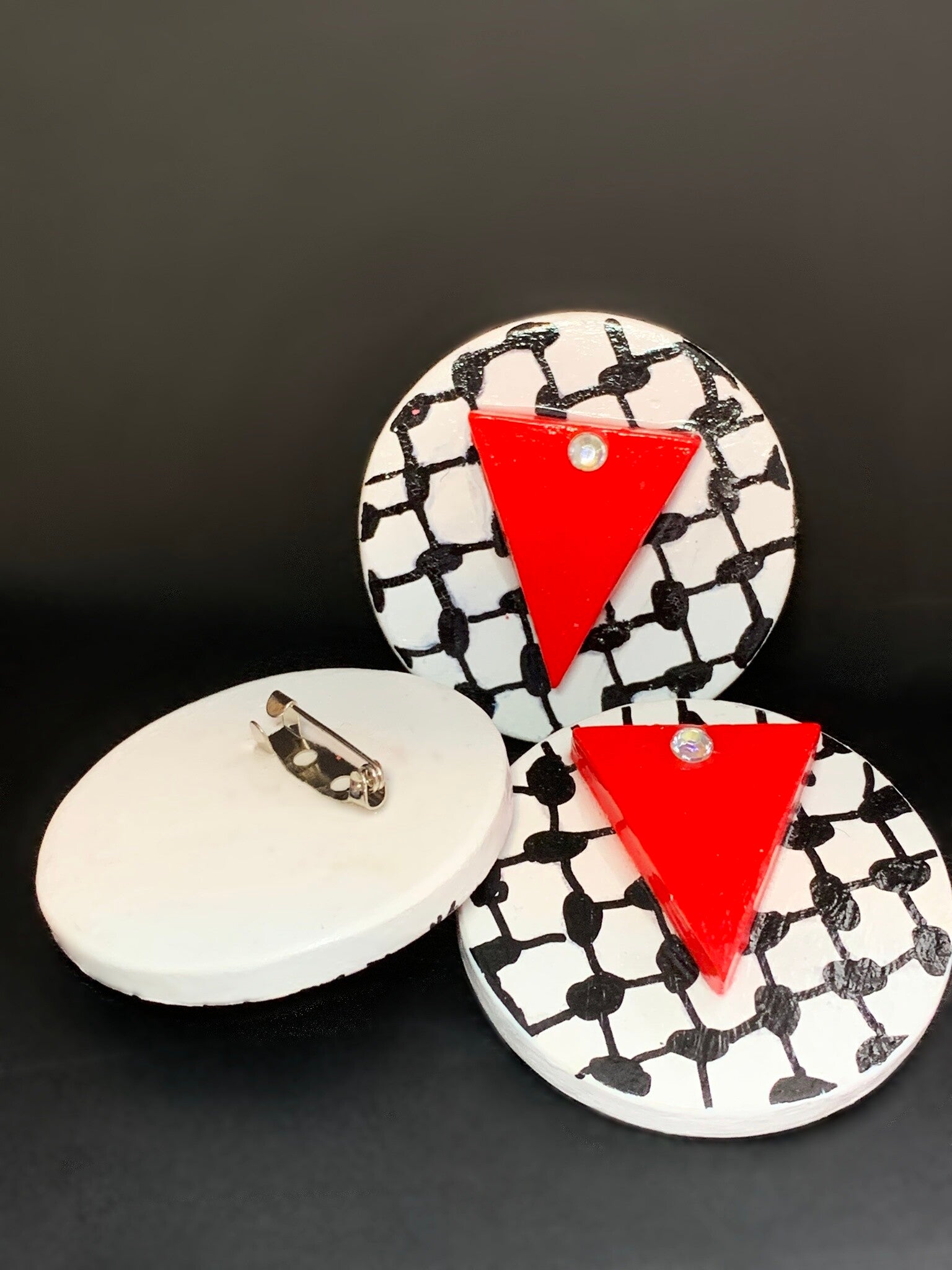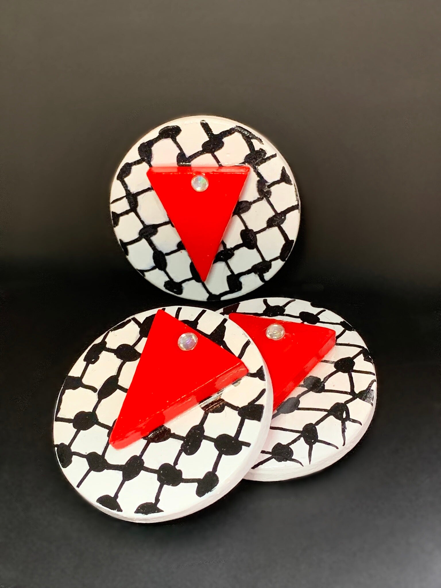 Each design is topped with a red triangle, representing resistance and steadfastness in the ongoing fight for justice and humanity. The red triangle is adorned with a small diamante, signifying that Palestinians are true diamonds — shaped and strengthened by the immense pressures they endure daily.