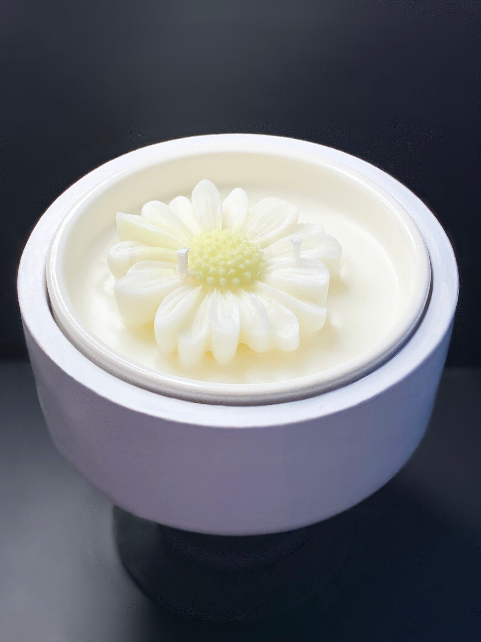 The Classy Candle is designed to elevate your hosting experience. It features a beautiful hand-crafted gypsum bowl, delicately perched atop a sturdy black stem, filled with a luxurious, double-wick parasoy wax candle.