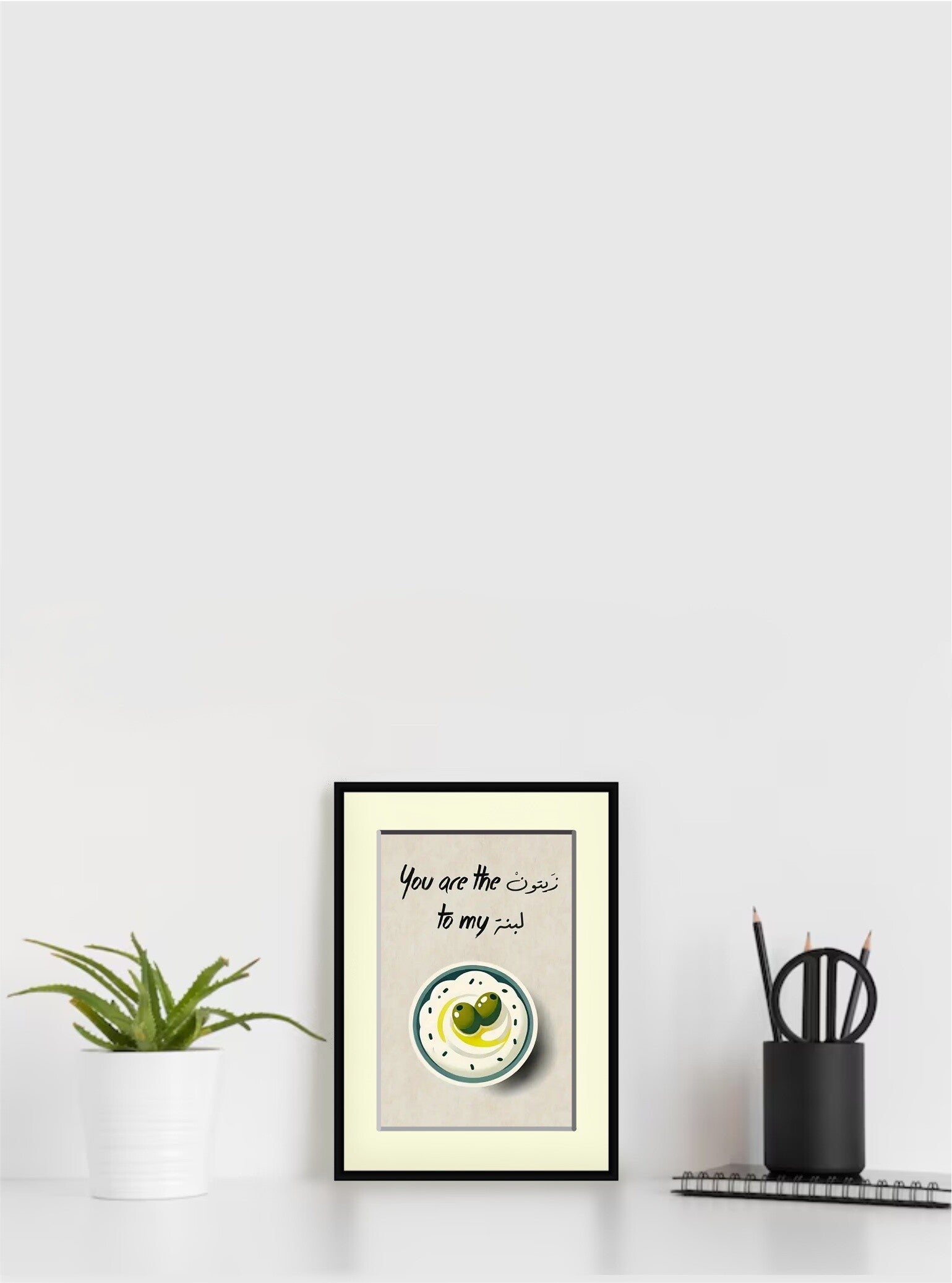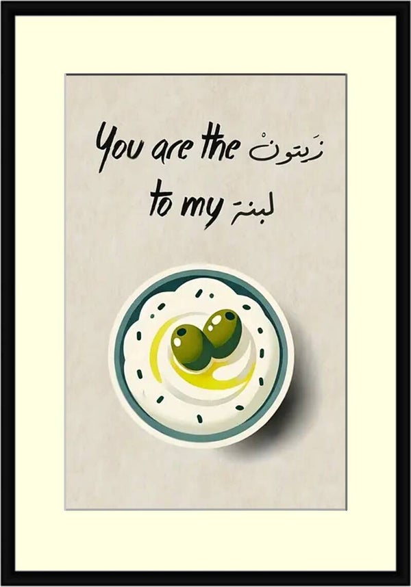This beautifully designed print features the affectionate phrase "You are the Olives to my Labneh," an endearing saying that compares the recipient to the perfect, essential complement to the creamy, tangy Labneh. It’s a witty and heartfelt way to say someone completes you!