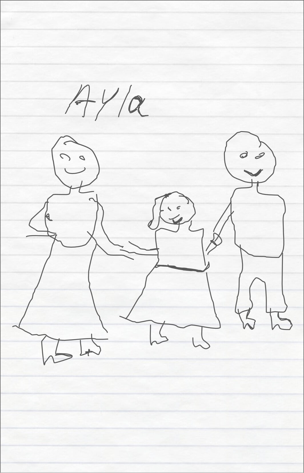 Now, Ayla cannot go to kindergarten. Her mother, Alaa, tries her best to keep life normal, but it’s a struggle that feels endless. There isn’t enough money to buy what children need—no crayons, no paints, not even a small notebook for drawing. Still, Ayla loves to draw. Her mother gives her scraps of paper so she can sketch with whatever she can find. One of her pictures shows a simple, powerful image: her family smiling together, holding hands, before the war changed everything.