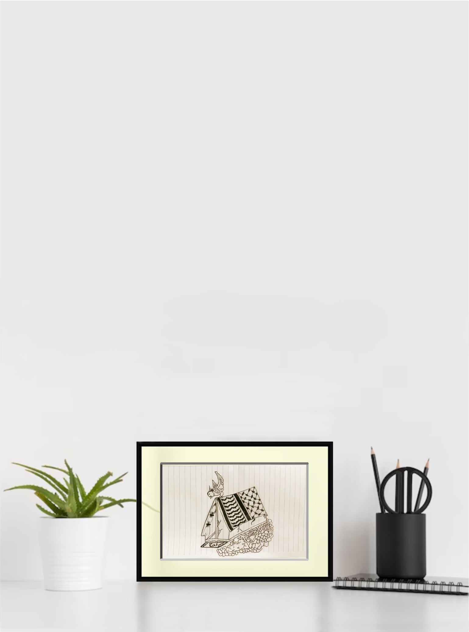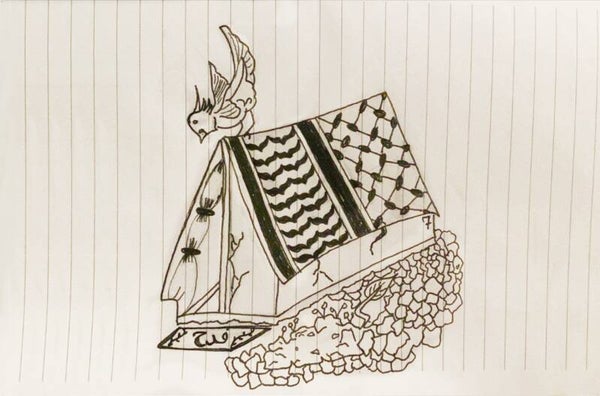 My drawing is not just a drawing but the reality of our struggles. In this drawing I want to show the world who we are and not only what we yearn for in this temporary world but what victory will look like for us. The tent shows you our struggle of displacement. The soil means people of Gaza will rise to harvest their crops, God willing. Bird brings freedom and the rubble means Gaza will be in history to show steadfastness.