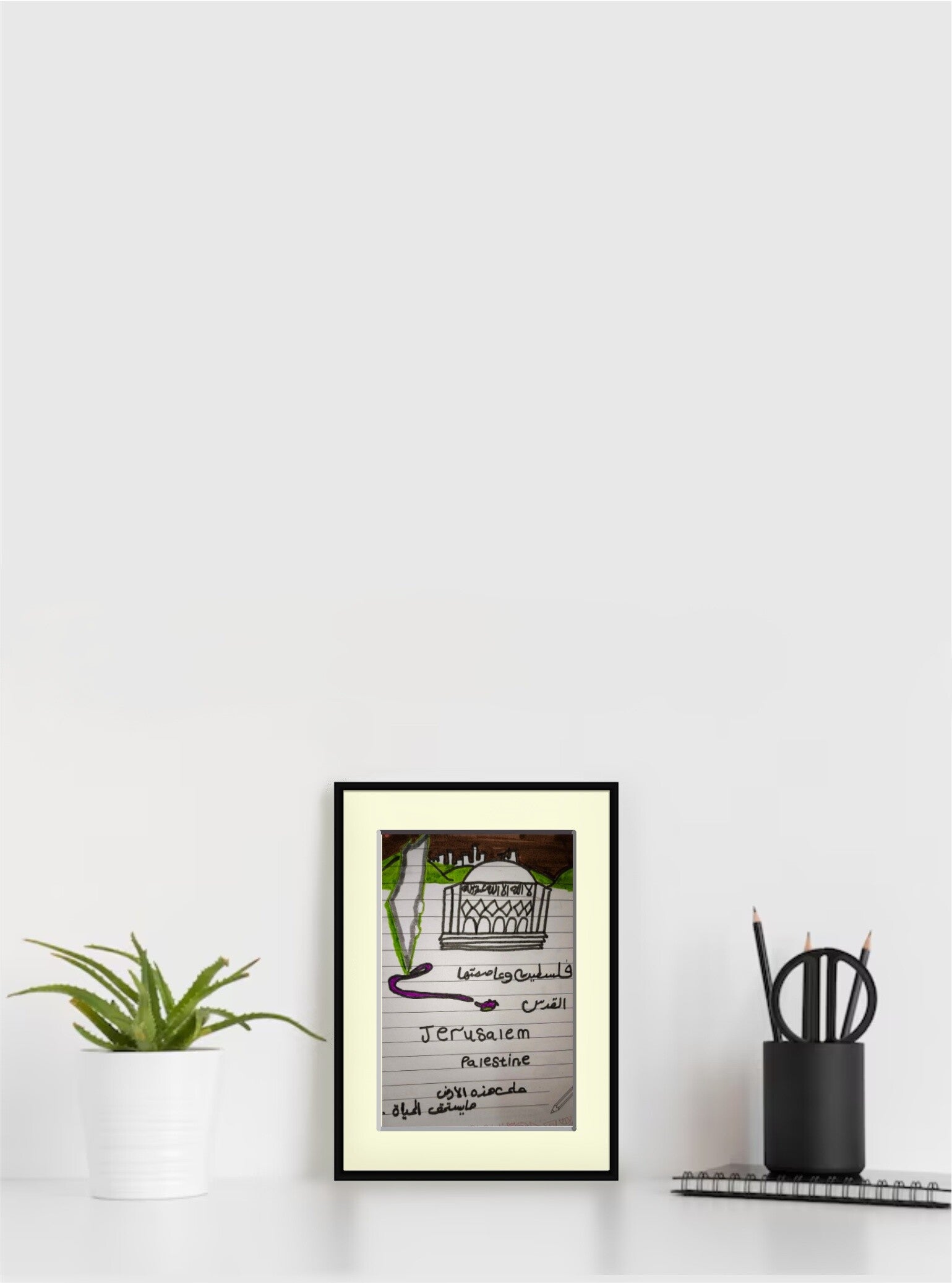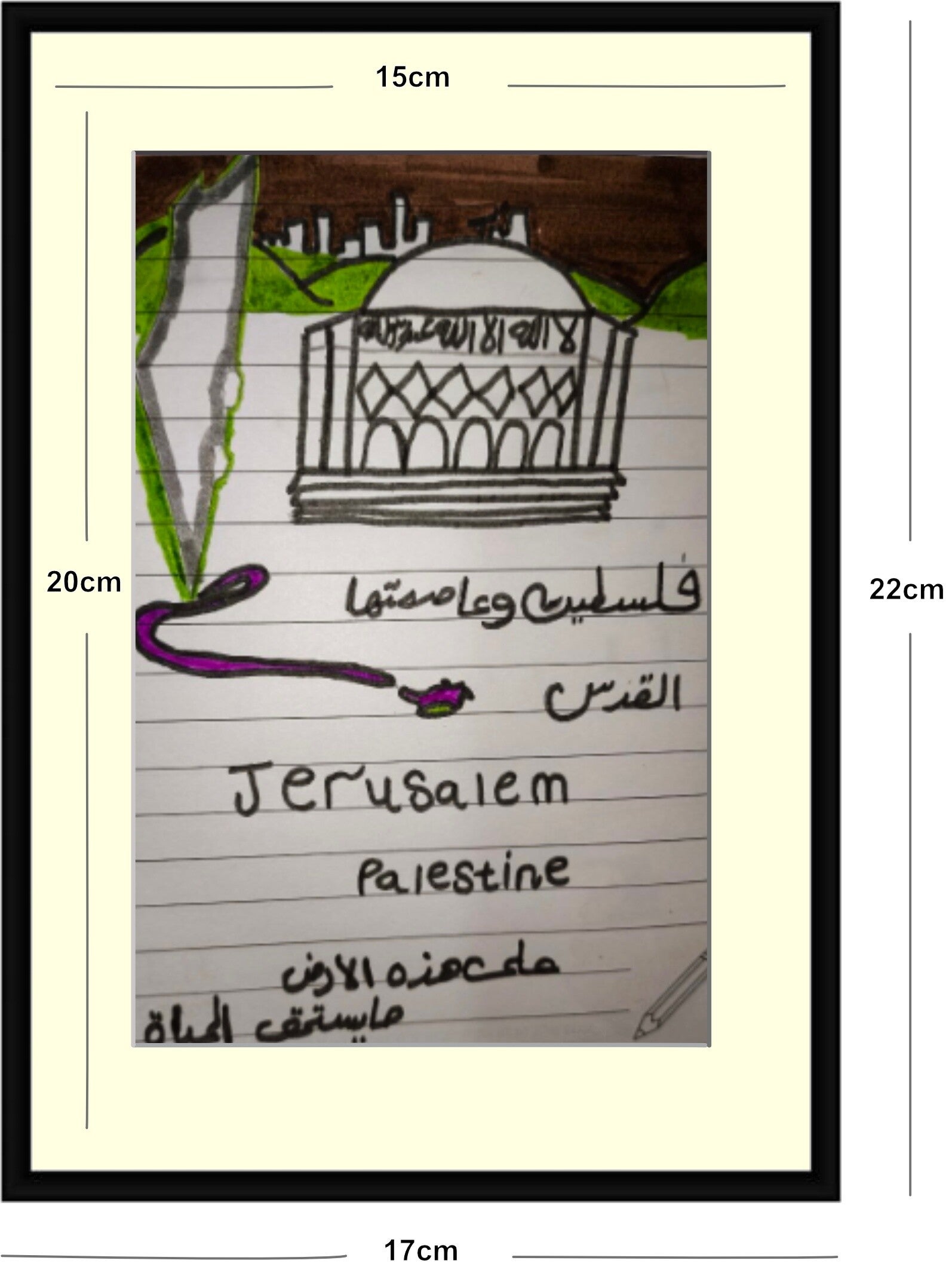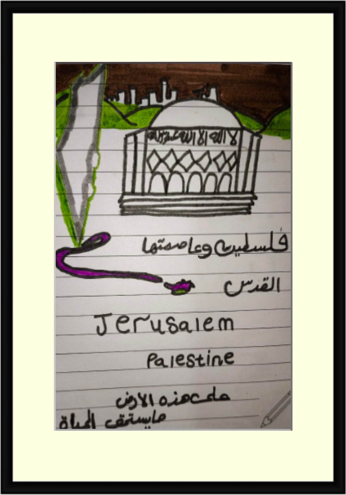 Yusuf loves to draw and write, he is very creative. What he has written reads: It is written on this earth what makes life worth living and also says Palestine and its capital is Jerusalem.